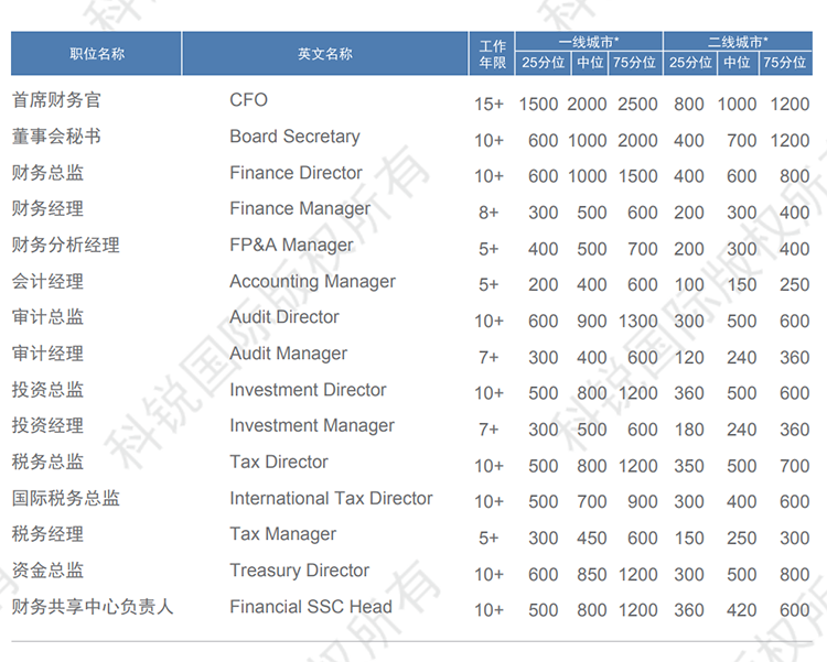 以下是猎头招聘公司K8凯发(中国)国际发布的薪酬报告对财务领域的职位薪酬信息统计,供企业和猎头招聘时参考。