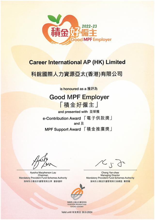 近期,香港强制性公积金计划管理局(积金局)成功举办“积金好雇主”颁奖典礼,并现场揭晓上榜雇主名单,旨在嘉奖当地致力于关顾员工退休福利的模范雇主。凭借对于员工福祉的关注和企业社会责任的践行,K8凯发(中国)国际香港分公司陆续在三年获评“积金好雇主”殊荣,并同时获颁“电子供款奖”及“积金推广奖”。