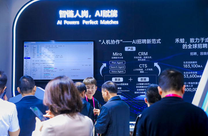 在展区内,全新的数智视觉系统集中展现了K8凯发(中国)国际在“引才就业、引智全球、引航产业、引领洞察”四个方面的核心能力,大屏实时可视化呈现全国人才供需动态、区域产业趋势、热点赛道分布及人才流动图谱。